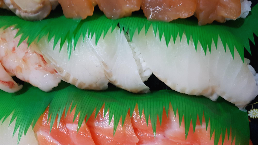 이 모듬초밥에서 보이는 농어의 겉모습은 위의 광어와 구별이 힘들다.