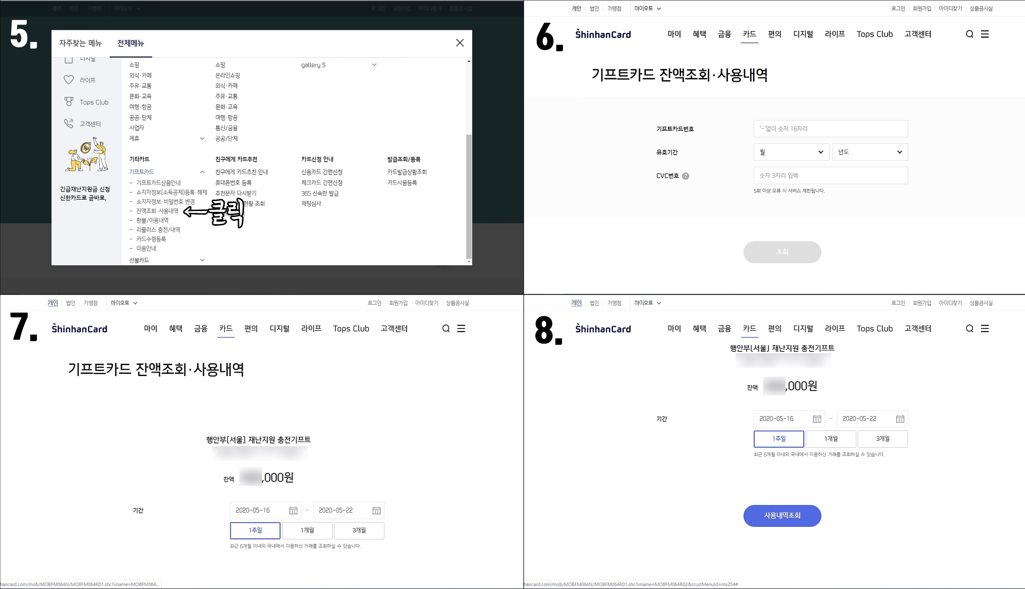 5. 기프트카드를 눌러 뜬 여러메뉴중 잔액조회·사용내역을 클릭한다.