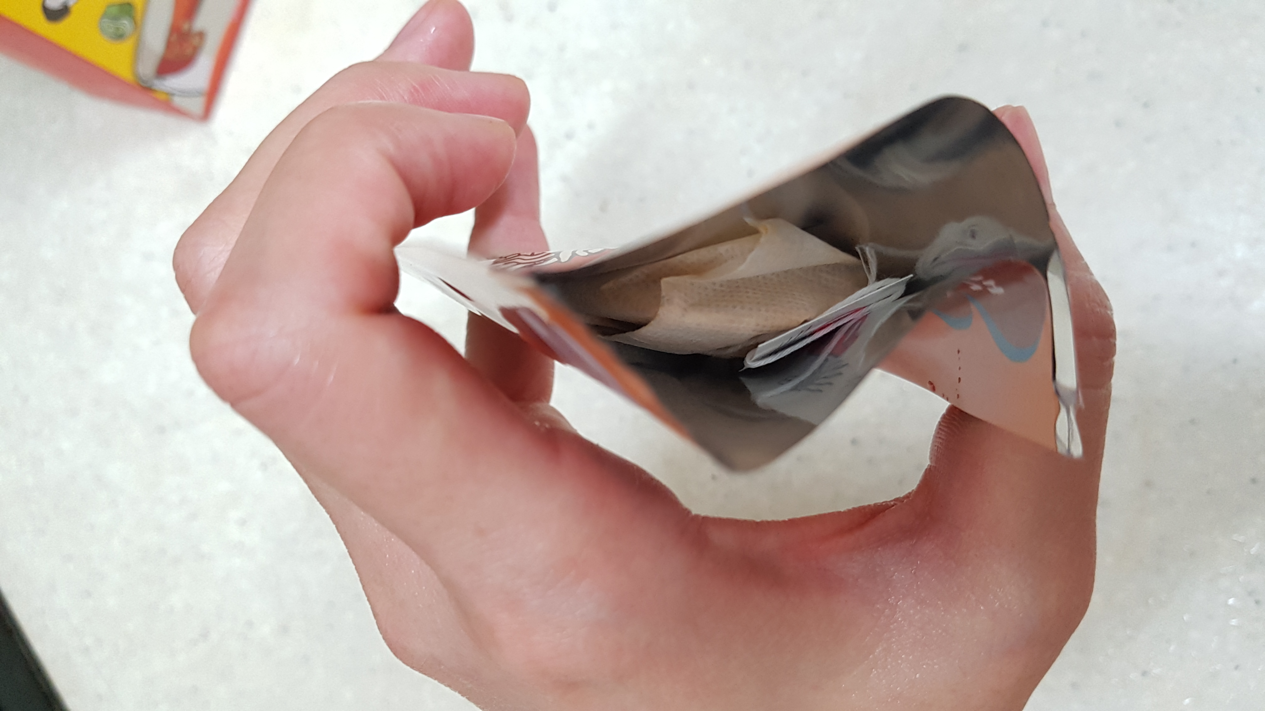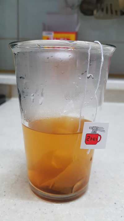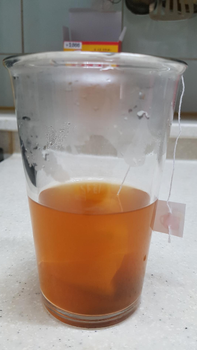 물이 끓기를 기다리는 동안 컵에 넣은 티백의 모습.