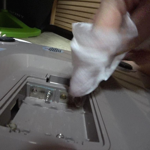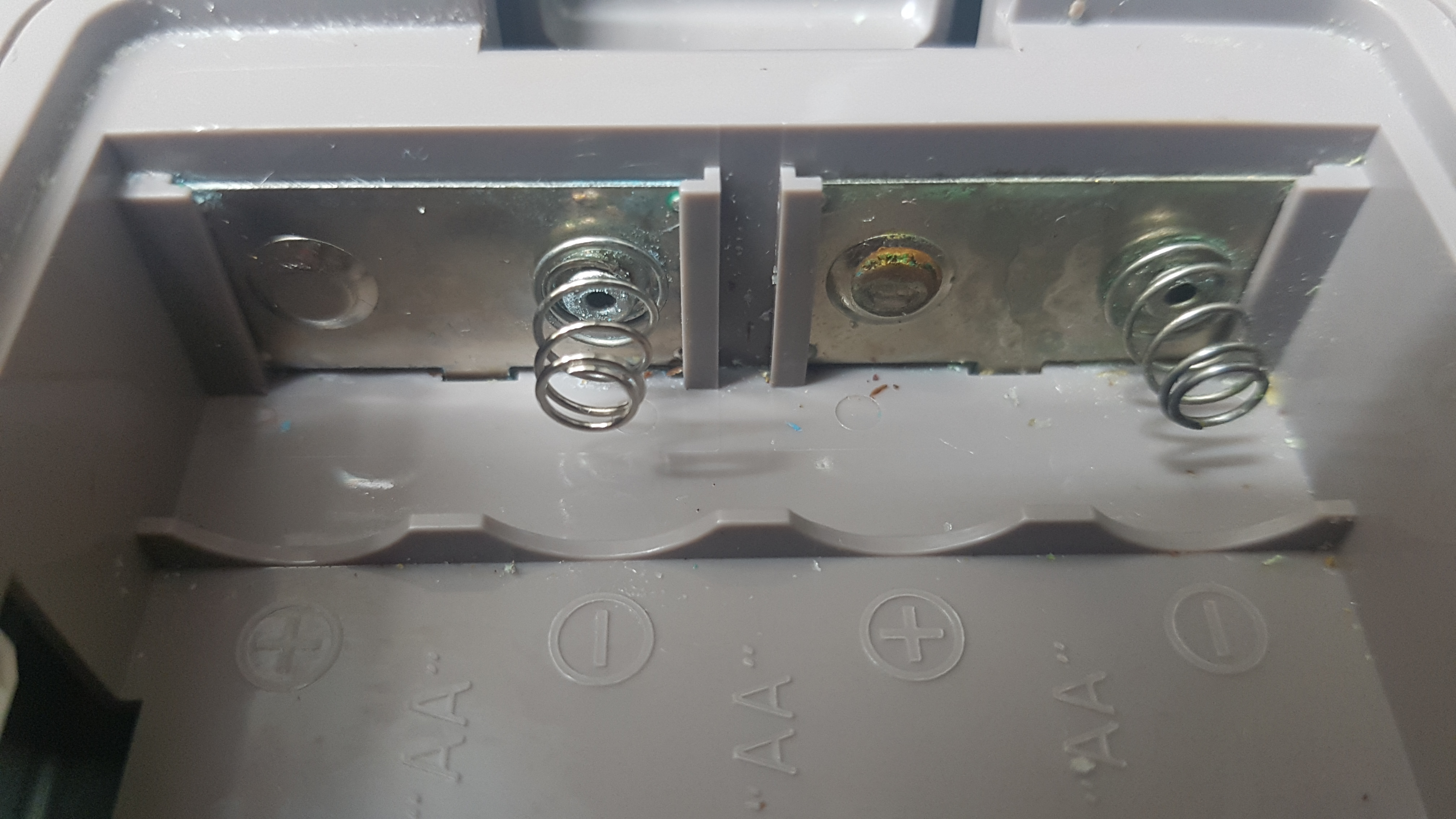 건전지 누액이 건전지 단자를 오염시켜놨다.
