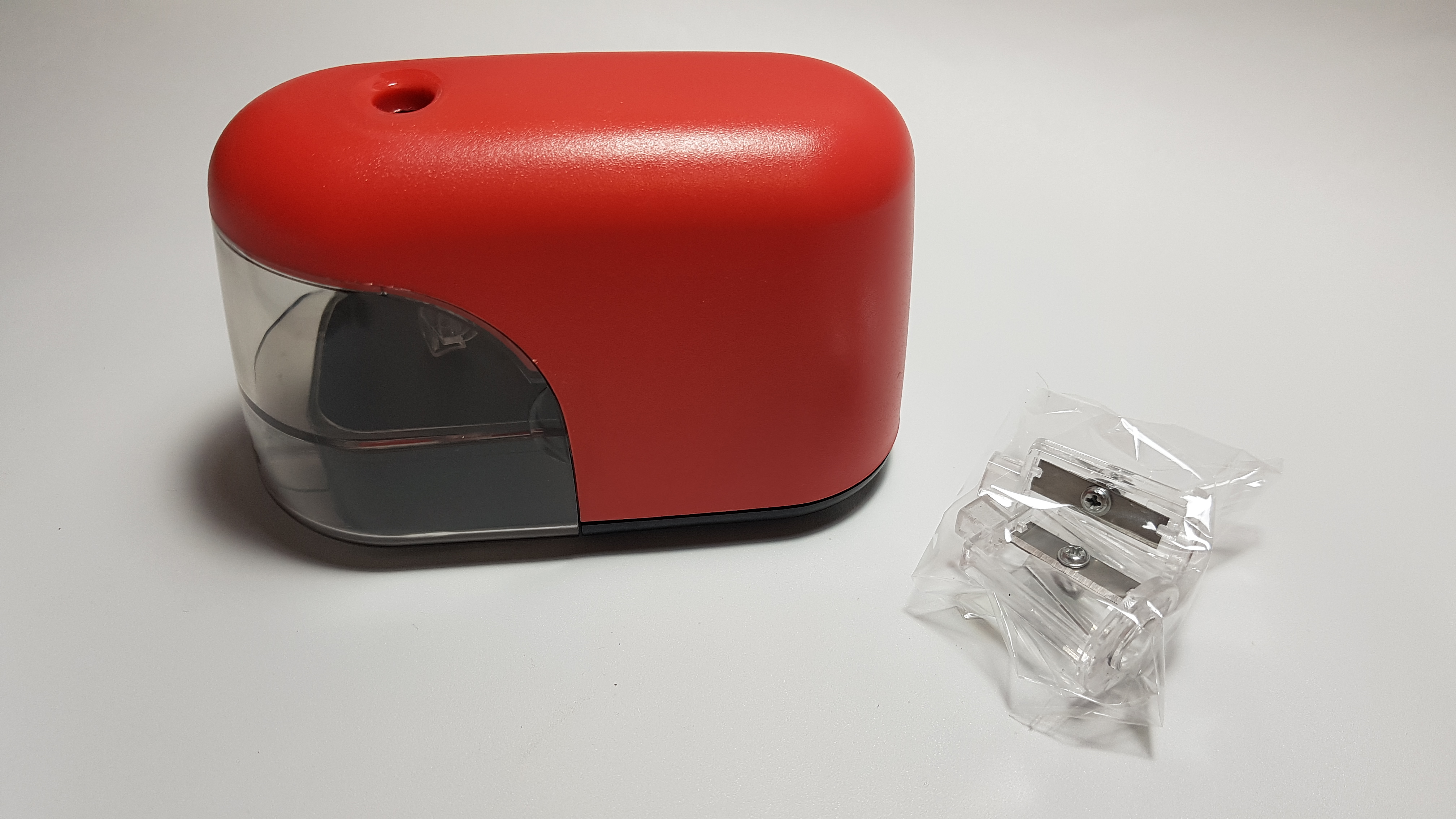 연필깎이 본체와 교체용 칼날 두 개.