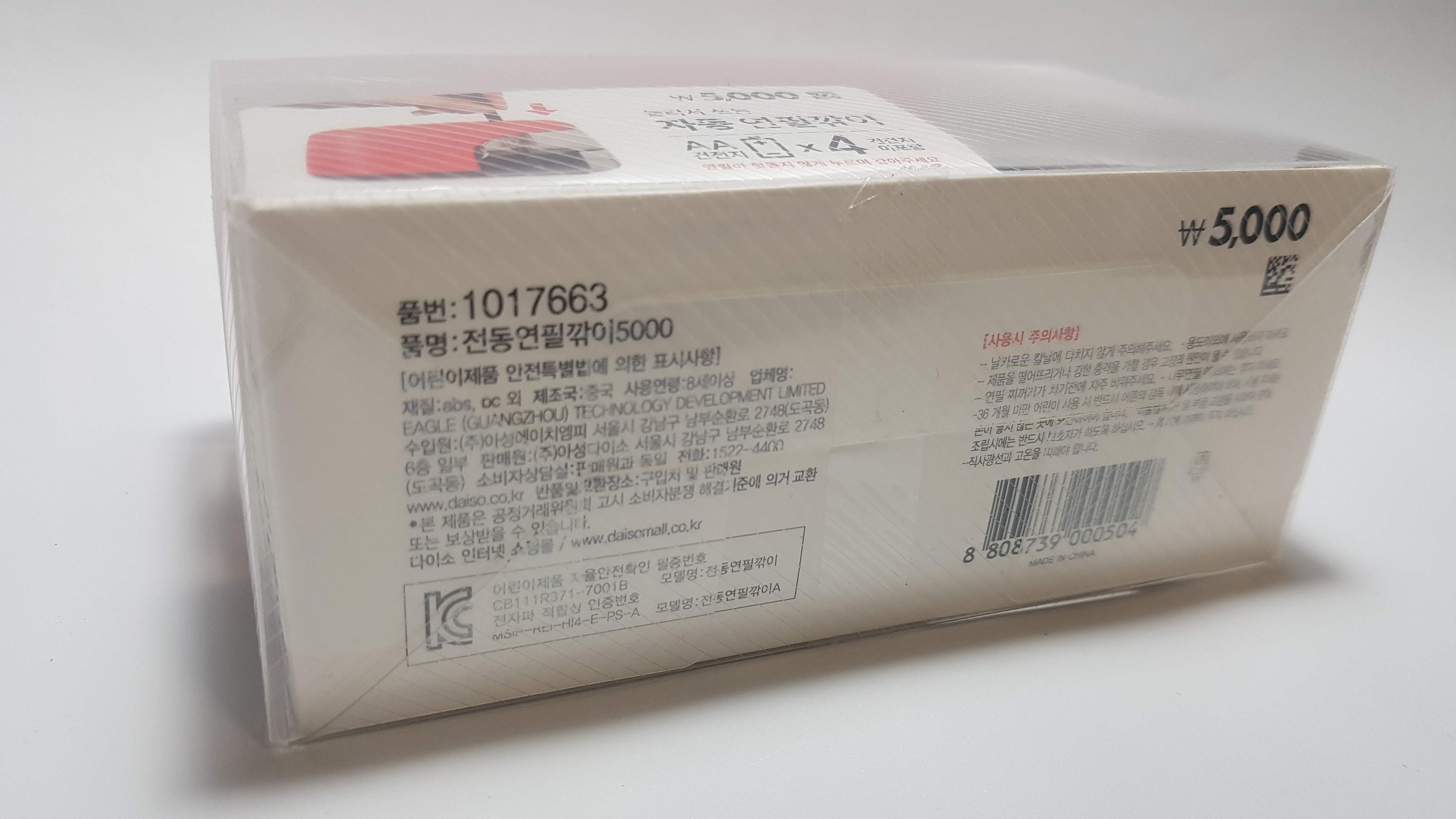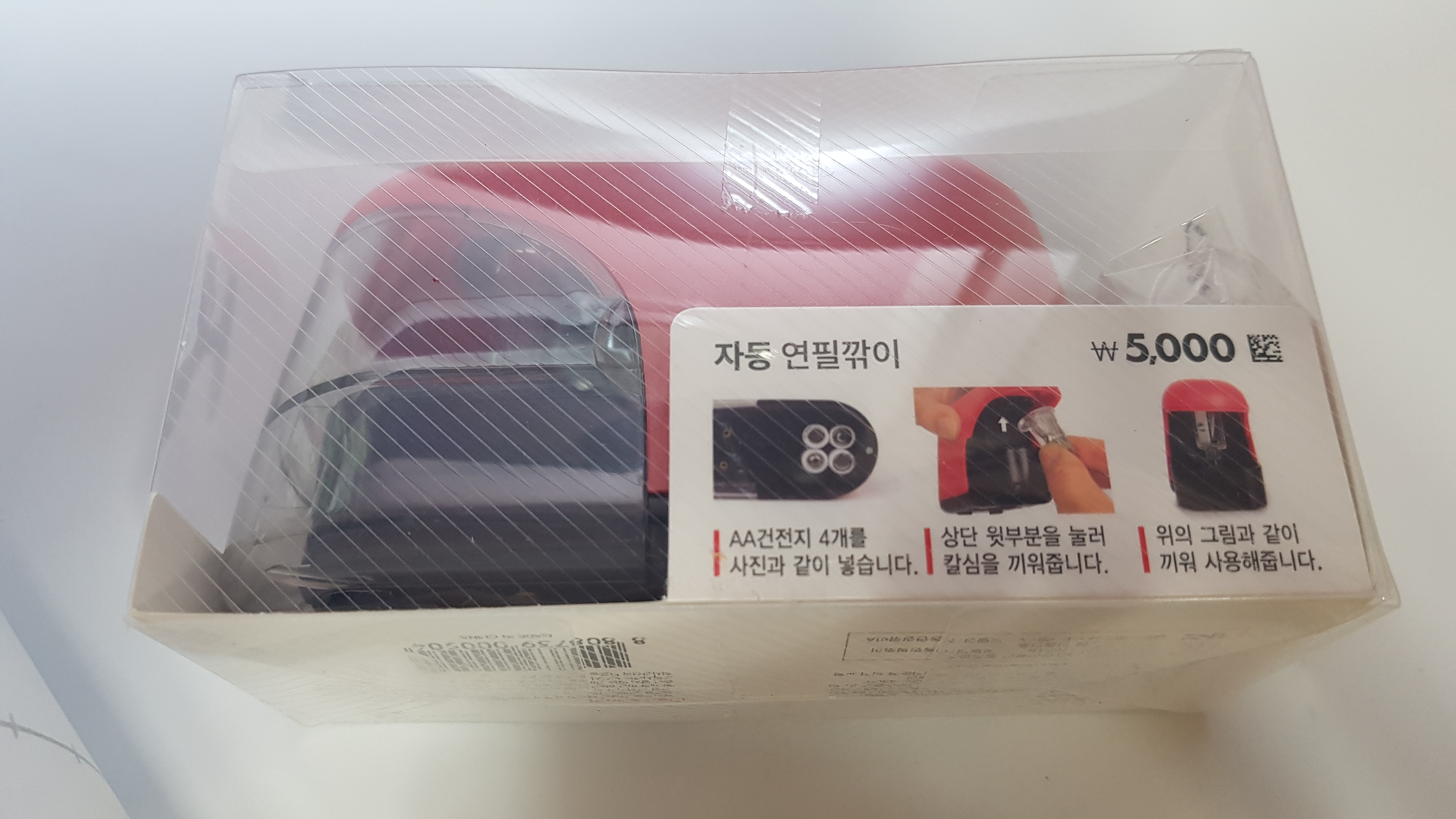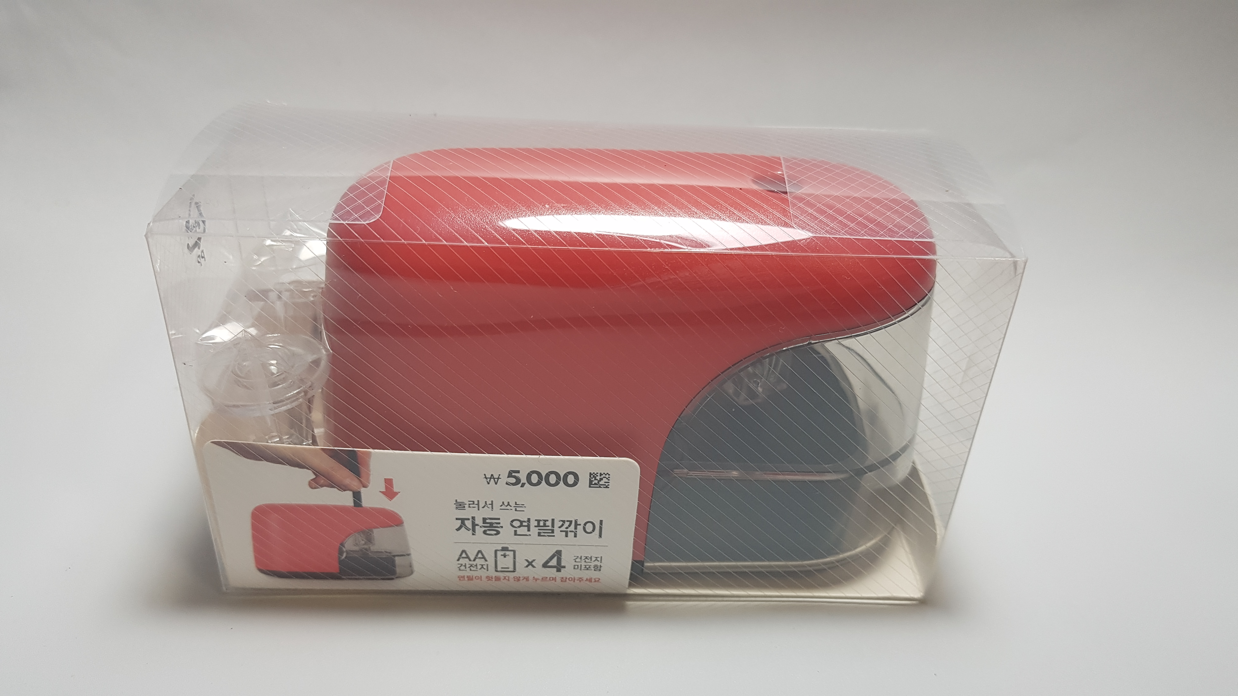 그렇게 구매한 다이소의 품명 전동연필깎이, 전면엔 눌러서 쓰는 자동 연필깎이라는 이것을 구매했다.