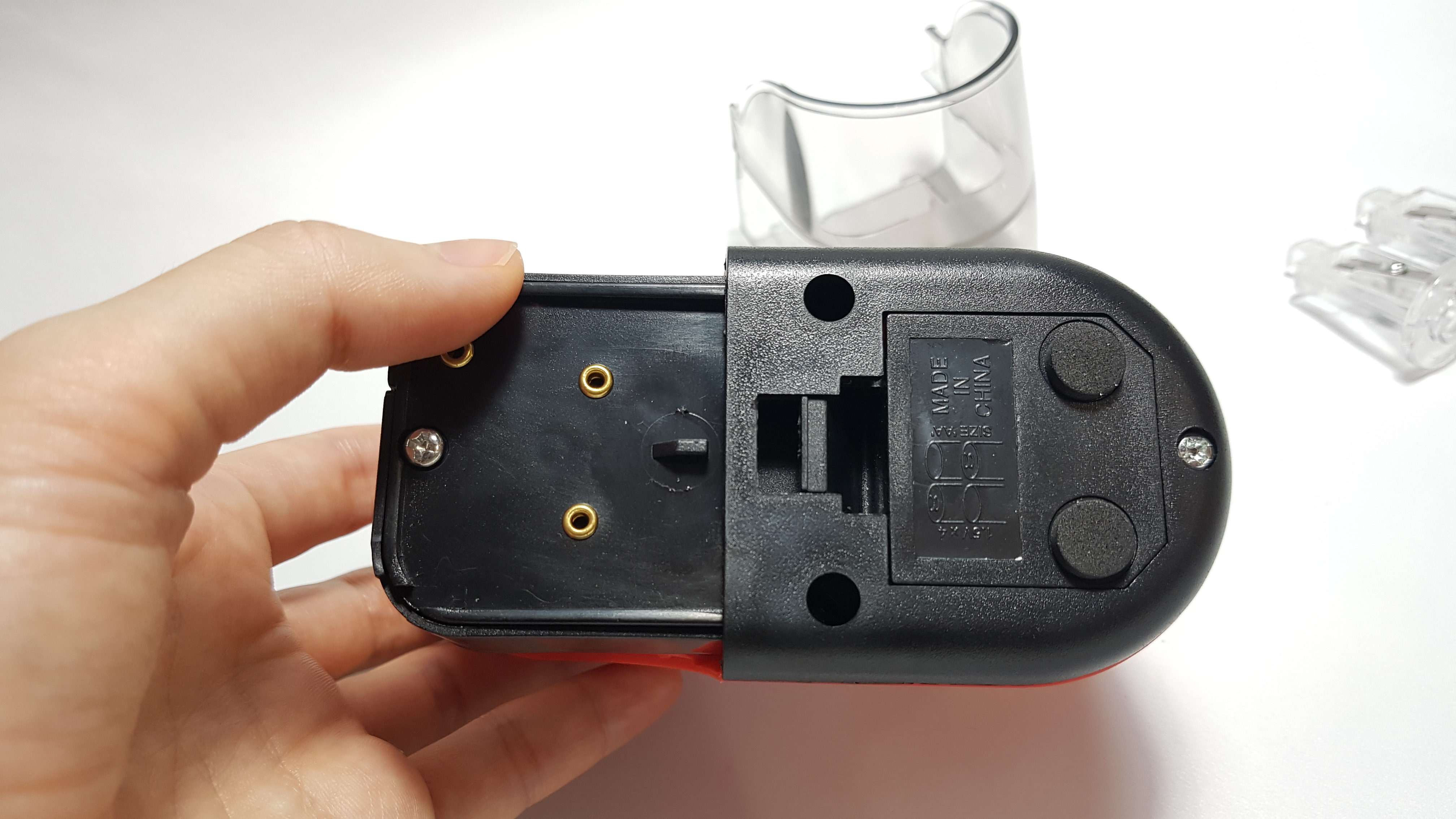 뒤집어서 아랫부분의 건전지 넣는 곳의 뚜껑을 열었다.