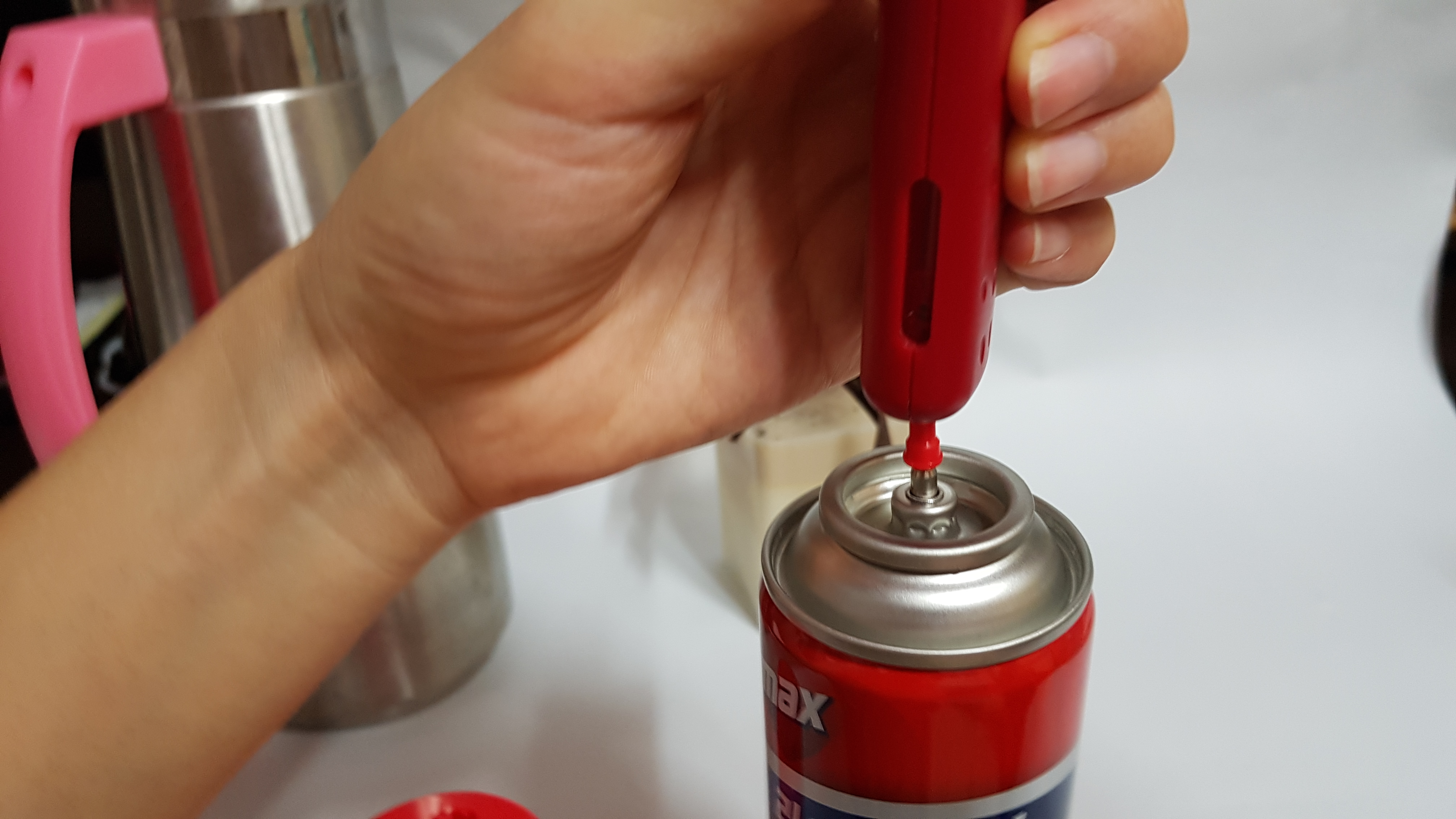 그런데 위의 사진처럼 가스통을 올려놓고 라이터를 아래로 누르면서 충전을 하려니 충전이 되지 않았다.