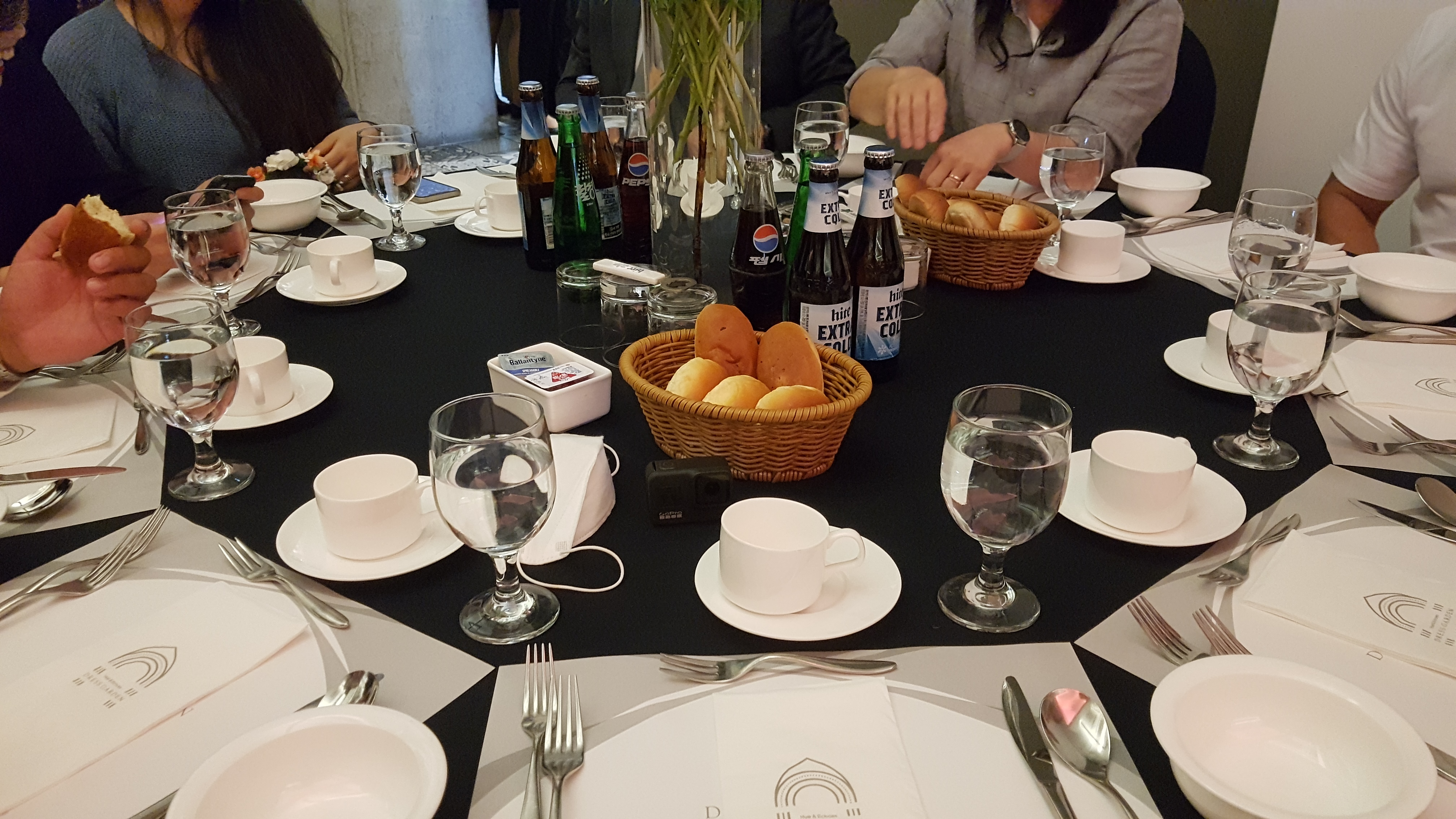 테이블 위에는 식전 빵과 버터, 딸기잼, 맥주, 사이다, 콜라, 식기들과 물 한잔이 있었다.