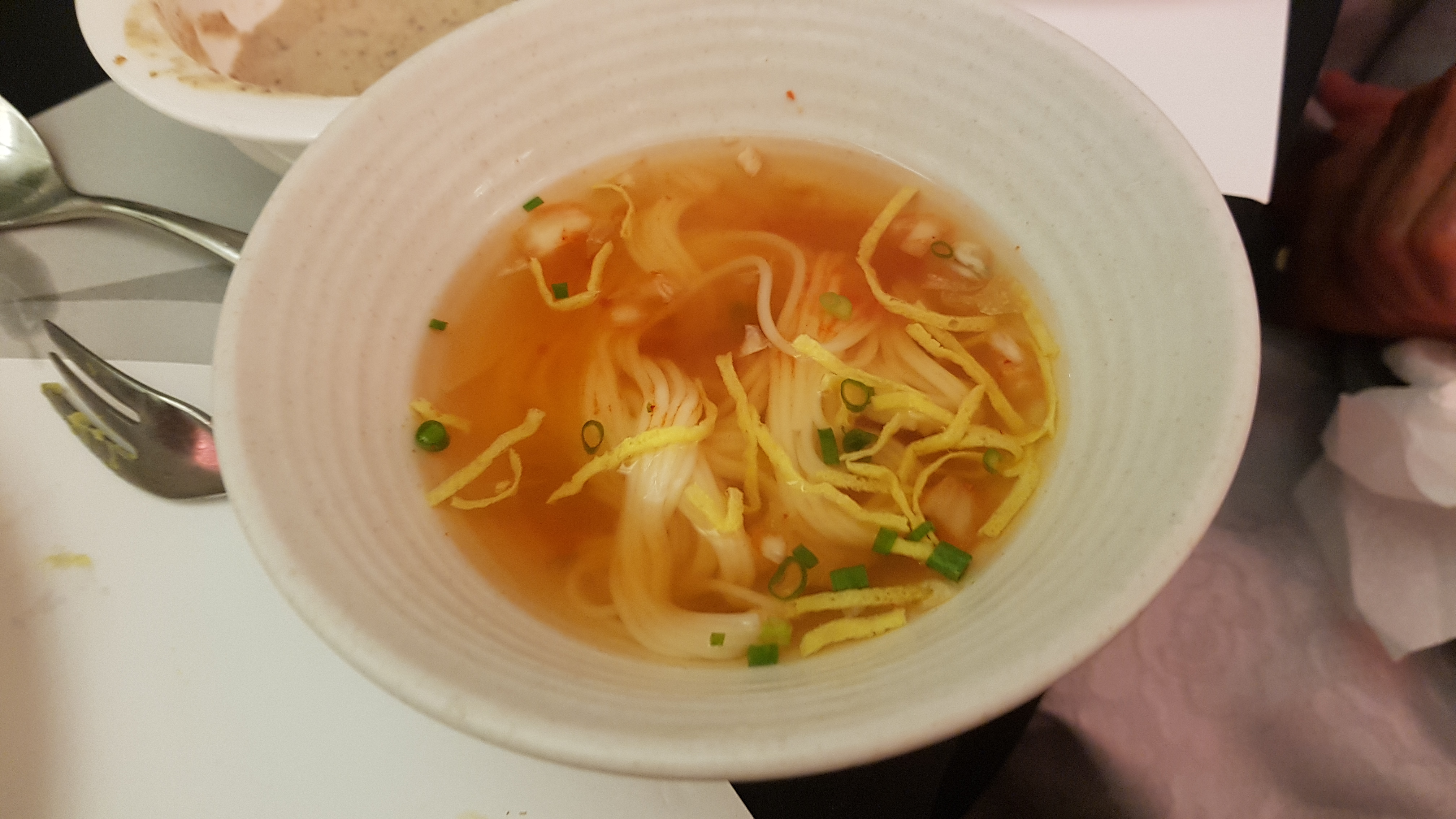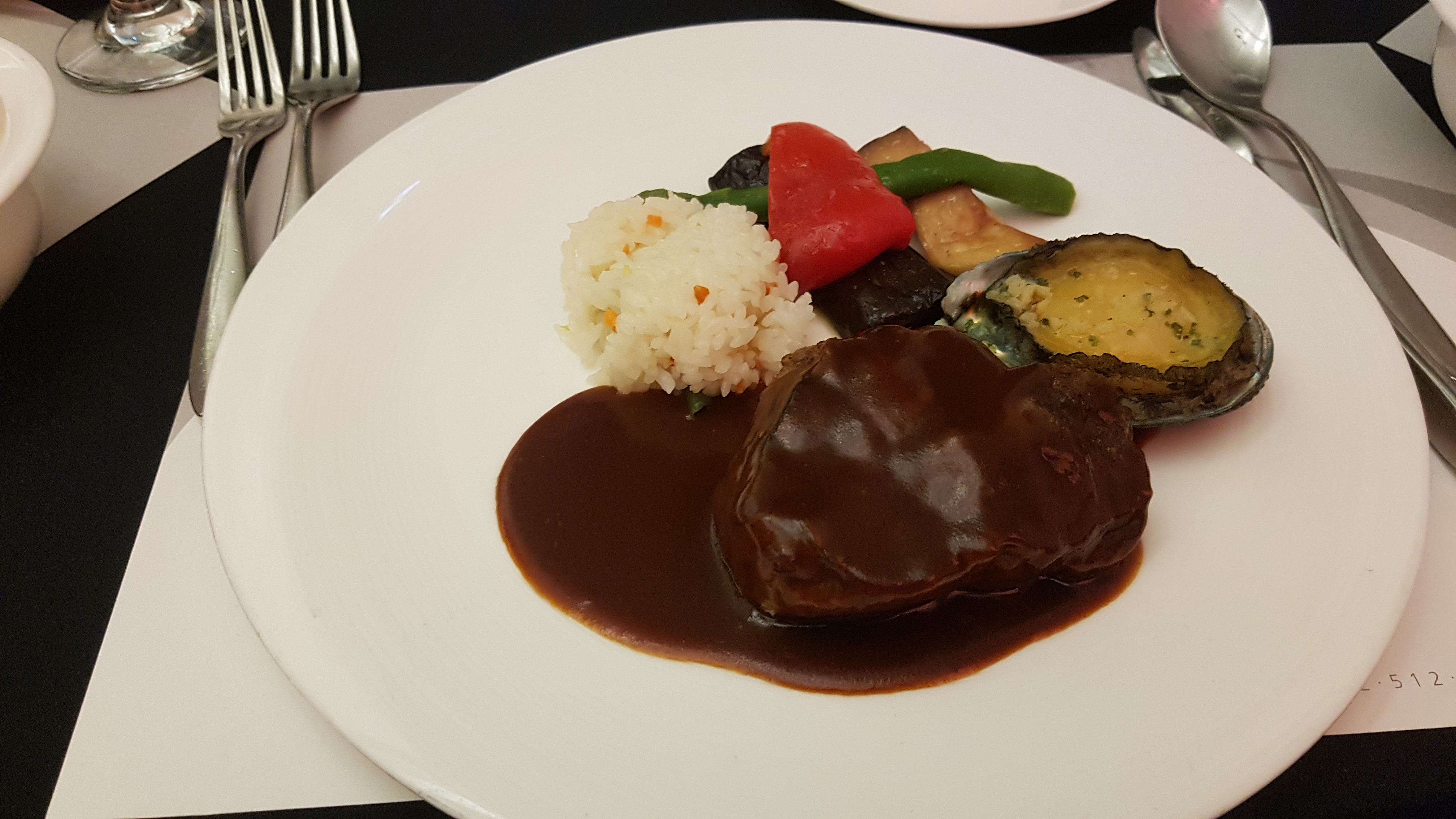 다음은 메인으로 버터 전복구이와 야채, 볶음밥이 곁들여진 소고기 스테이크와 잔치국수.