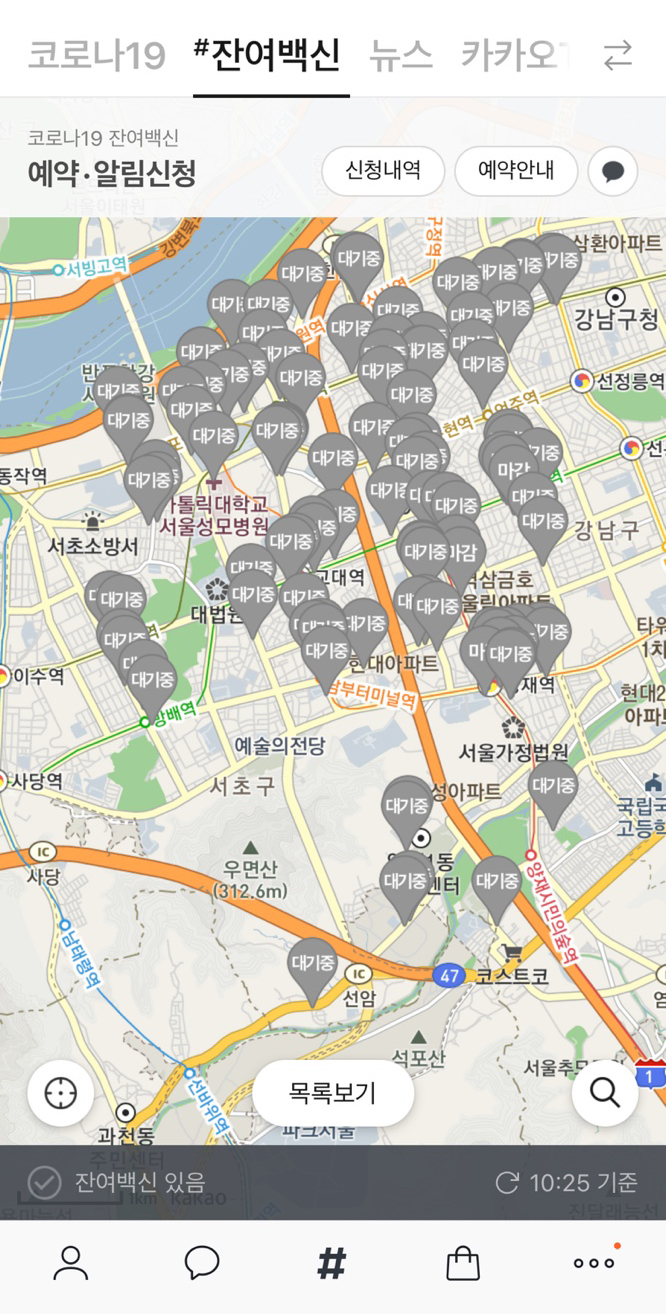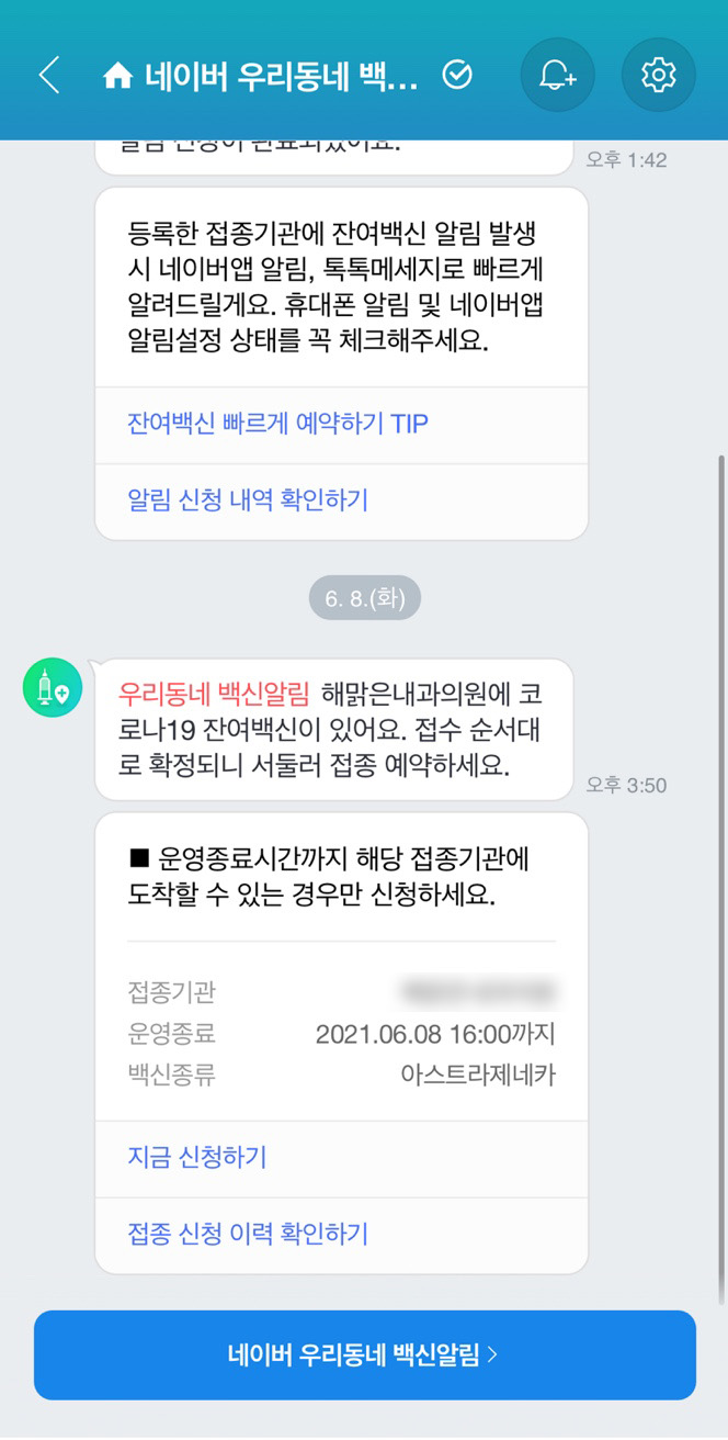 네이버와 카톡으로 집에서 제일 가까운 병원들로 잔여백신 알림을 신청해두었다.