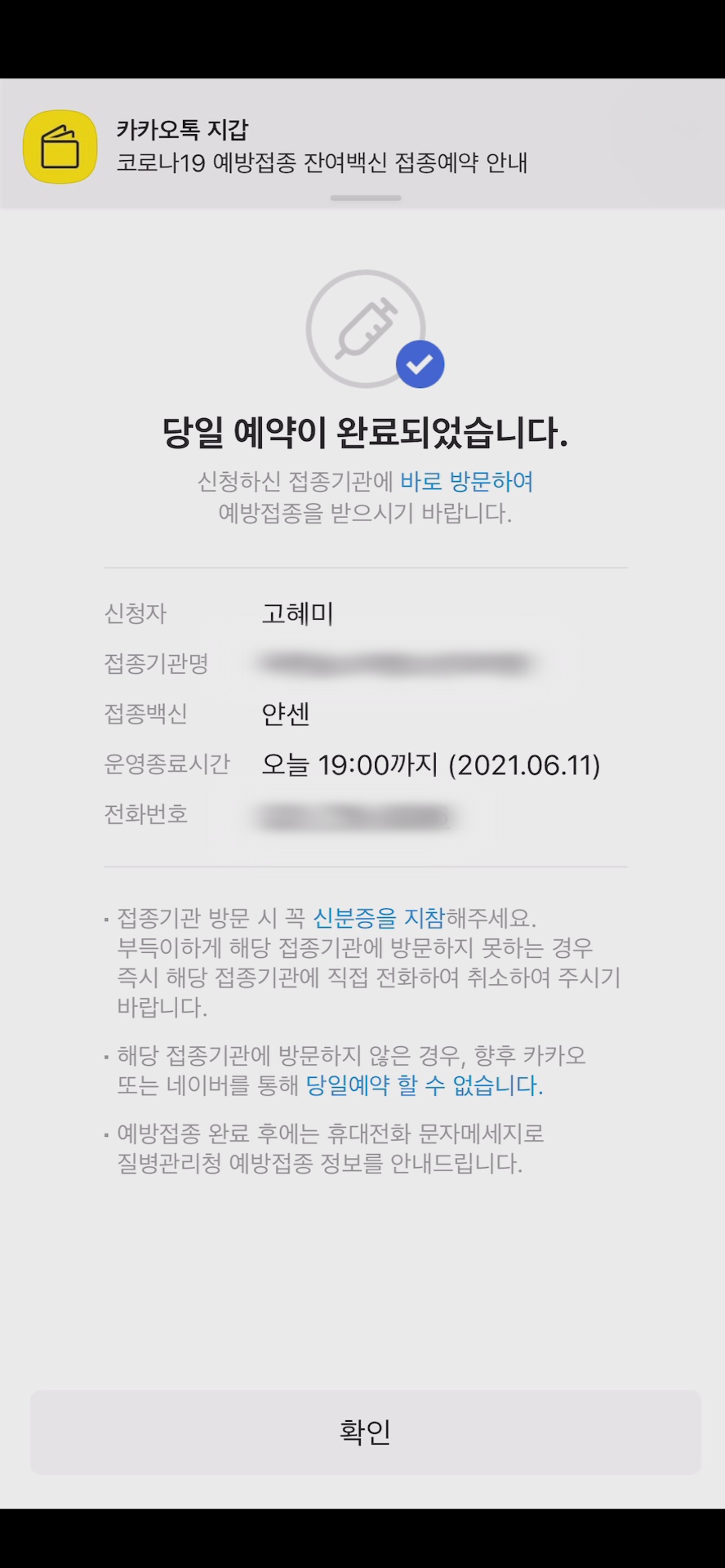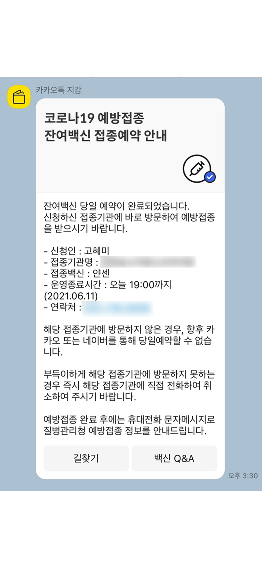 이렇게 예약에 성공하면 카톡으로 안내톡이 온다.